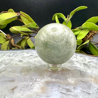 This Aquamarine sphere shimmers with cool blue-green tones, accented by natural inclusions that give it depth and uniqueness. Its smooth polish enhances the tranquil, watery hues of the stone.