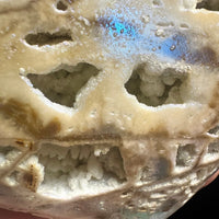 This striking aura-coated Sphalerite heart shimmers with a captivating rainbow sheen, enhanced by sparkling druzy pockets that add depth and texture. This heart is truly an eye-catching piece that combines natural beauty with a touch of iridescent brilliance.
