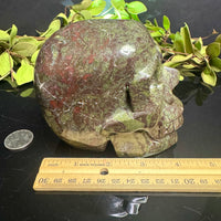 Carved from genuine Dragon Blood Jasper, this striking skull showcases a rich blend of deep forest greens and bold crimson veining, giving it a dramatic and earthy presence. This skull is a substantial piece with impressive detail and a polished finish that enhances the natural beauty of the stone.