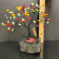 Vibrant and full of life, this one of a kind handmade wire crystal Mojo Tree bursts with color through its dyed coral branches on a black tourmaline base. Dyed red coral chips add fiery energy, while a wooden feather charm sways from its branches, adding movement and personality. This lively centerpiece radiates creativity and warmth.