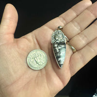 This captivating pendant features a polished hypersthene stone set in a sleek bezel of .925 sterling silver. The elongated teardrop shape of the stone highlights its shimmering striations of deep charcoal and silvery gray. Atop the pendant sits a beautifully detailed goddess face with flowing, swirling hair, adding a mystical, feminine energy to the piece. Hypersthene is often associated with inner reflection, mental clarity, and grounding, making this pendant a meaningful adornment as well as a striking accessory.