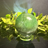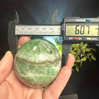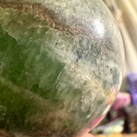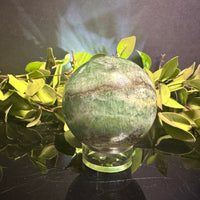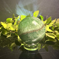 This striking Green Onyx sphere features soft mossy green tones with a natural tan band running through its center, adding depth and earthy contrast. Polished to a glossy finish, it beautifully highlights the stone’s organic patterns and soothing coloration.