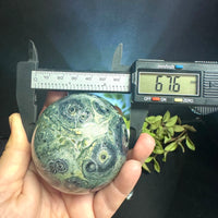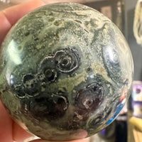 This one-of-a-kind Kambaba Jasper sphere showcases rich, swirling patterns of deep green and black, creating an organic, almost fossil-like appearance. Smoothly polished, the stone’s natural patterning flows beautifully across the surface, making it a striking and unique display piece.