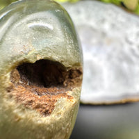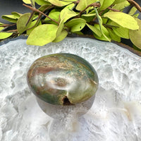 Deep greens with soft beige veining give this palm stone an earthy, forest-like appearance. A natural vug hole is reminiscent of a forest cave. Ideal for nature lovers and those seeking a tranquil aesthetic.