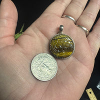 This exquisite round Tiger’s Eye pendant captures the stone’s golden radiance and mesmerizing sheen. The surface is adorned with a finely carved floral motif, highlighting the stone’s natural depth and golden-brown luster. Framed in sleek .925 sterling silver, this pendant brings together earthy warmth and refined artistry.