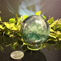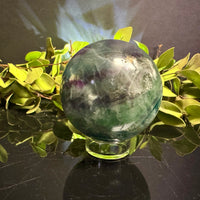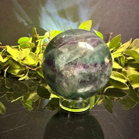 This captivating Snowflake Fluorite sphere displays a stunning blend of soft purples, greens, and milky white inclusions that form delicate, snowflake-like patterns throughout the stone. Its smooth, polished surface highlights the natural artistry within each piece, making every sphere one of a kind.