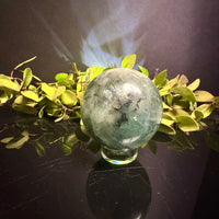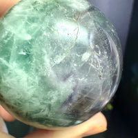 This captivating Snowflake Fluorite sphere displays a stunning blend of soft purples, greens, and milky white inclusions that form delicate, snowflake-like patterns throughout the stone. Its smooth, polished surface highlights the natural artistry within each piece, making every sphere one of a kind.
